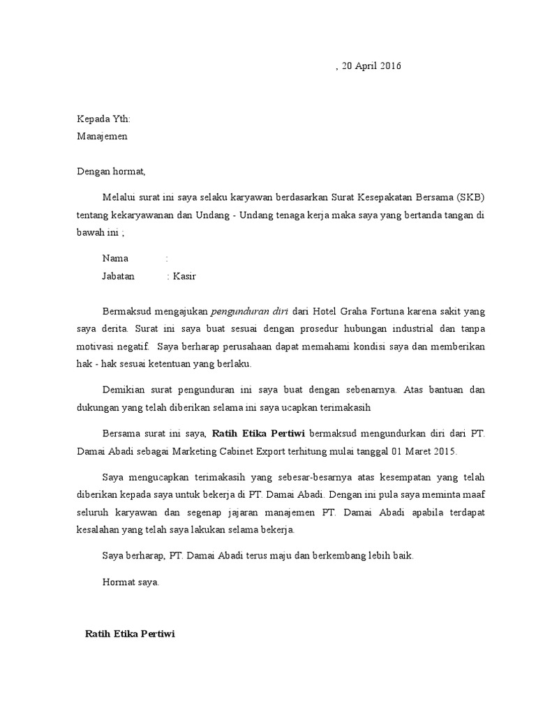 Dan harapannya, ia bisa tetap bekerja sampai jangka waktu yang lama bahkan hingga pensiun. Maka dengan memberikan contoh surat pengunduran diri dari organisasi, anda sudah menyatakan untuk melepaskan diri dari semua kewajiban dan tanggung jawab tersebut berikut adalah beberapa contoh surat pegunduran diri dari organisasi yang bisa anda pergunakan sebagai bahan referensi. Savesave contoh surat pengunduran diri for later. Kepala bagian personalia / hrd. Sebagai seorang manusia, tentu terkadang ada masalah yang dihadapinya, sehingga membuat mereka memiliki permasalahan dalam pekerjaan.
