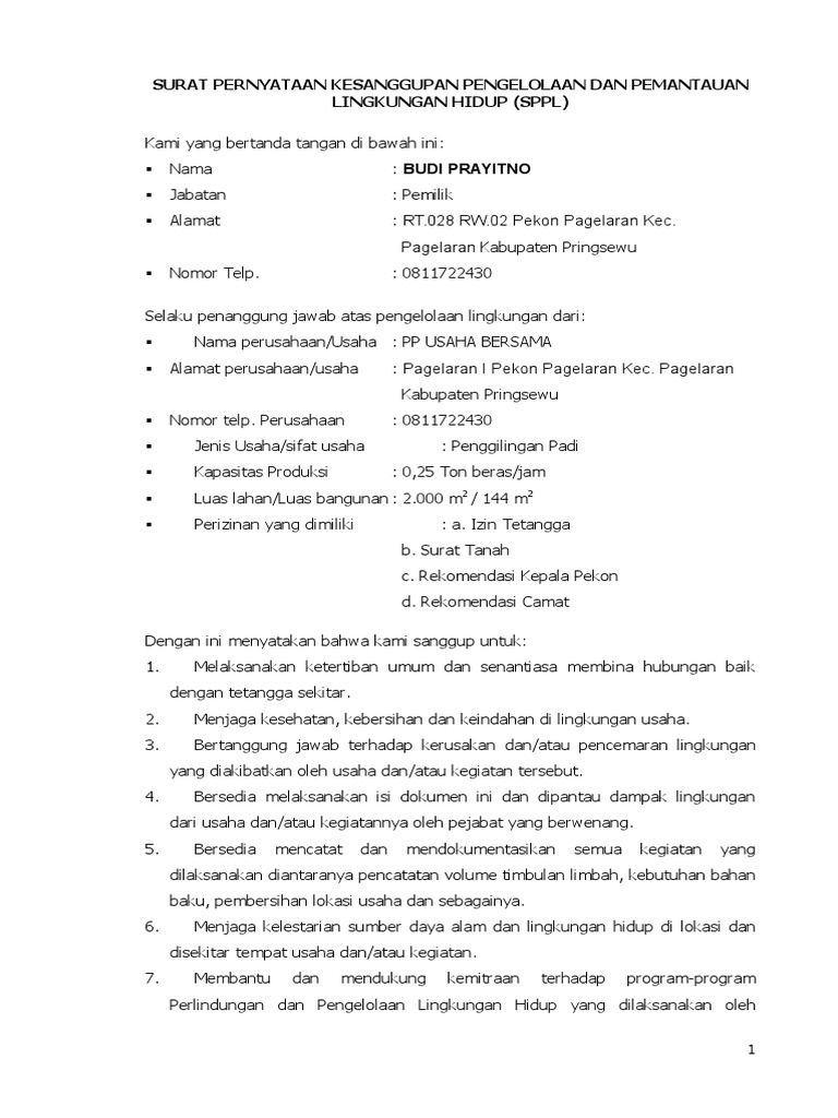 ' * * * form 1 sppl format surat pernyataan kesanggupan pengelolaan dan pemantauan lingkungan hidup (sppl). .pernyataan kesanggupan pengelolaan dan pemantauan lingkungan hidup ( sppl 5. Surat pernyataan kesanggupan pengelolaan dan pemantauan lingkungan hidup (sppl). Menjaga kesehatan, kebersihan dan keindahan di lingkungan usaha. Surat pernyataan persetujuan tetangga yang ditandatangani kelurahan dan kecamatan setempat.